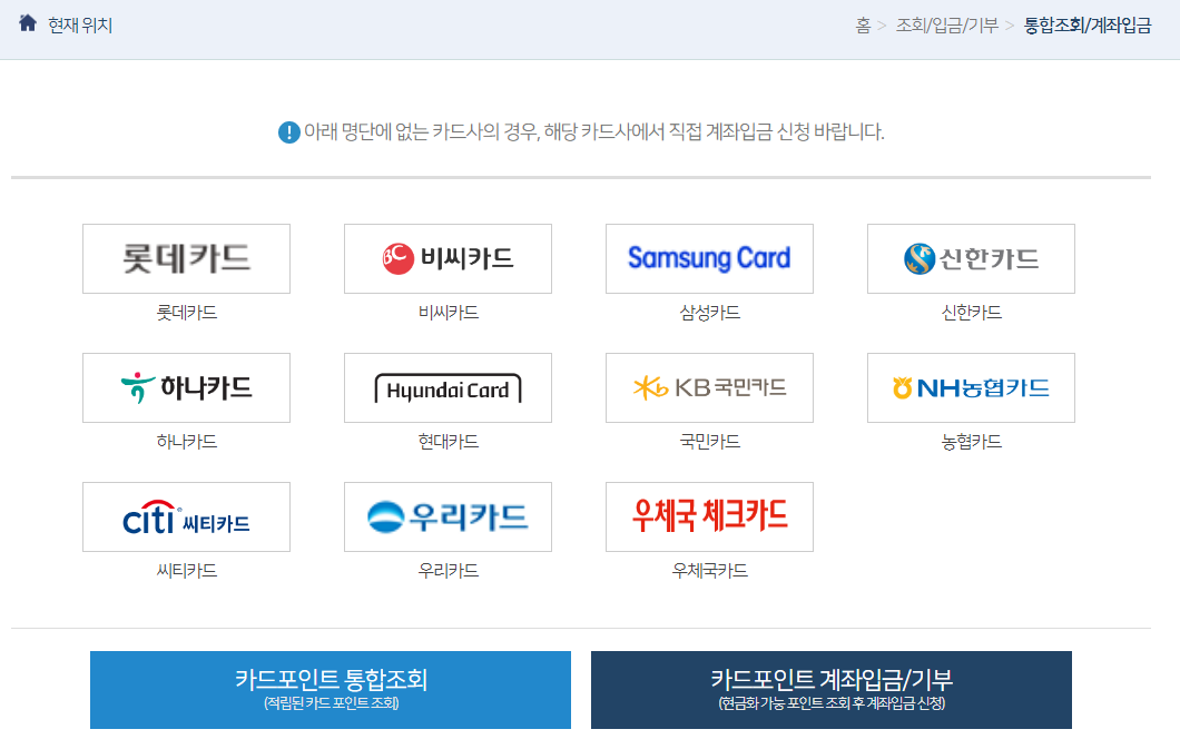 2. 각 카드사별 포인트 계좌입금의 처리기한이 상이합니다. 확인 바랍니다.