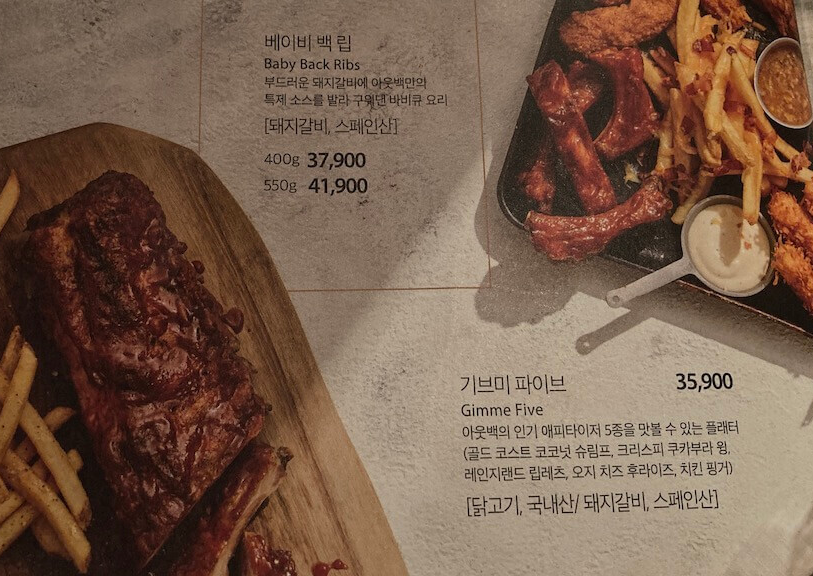 - 베이비 백 립: 400g 39,000원/550g 43,900원 - 기브미 파이브: 38,900원