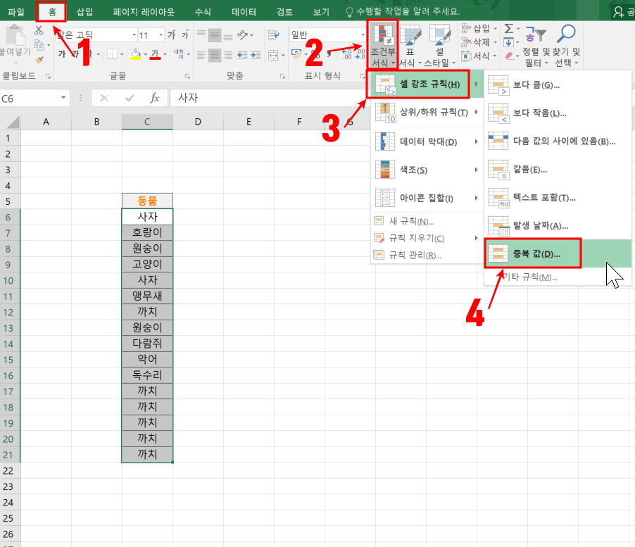 조건부 서식 메뉴로 엑셀 중복값 표시하기