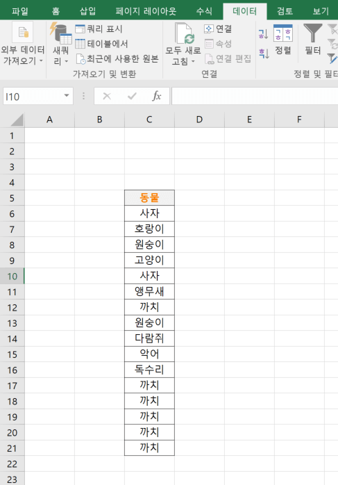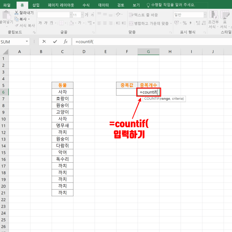 • 괄호 안에 범위와 콤마를 입력합니다. 범위는 동물 이름을 입력한 표를 드래그하여 선택하고, 콤마는 , 를 입력합니다.