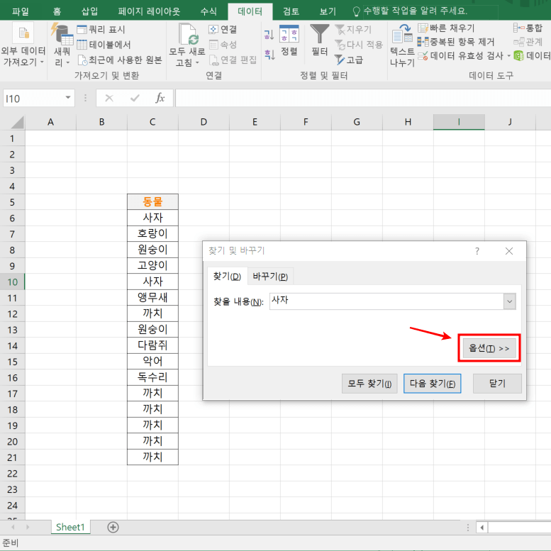 • 검색창에 "사자"라고 입력하면 해당 단어가 포함된 셀이 하이라이트 됩니다.