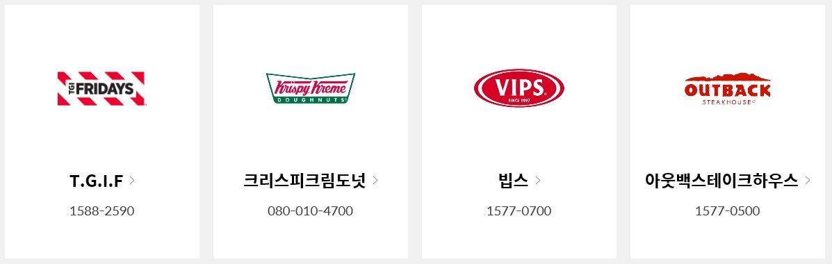 롯데상품권의 세번째 사용처는 외식분야입니다. TGIF, 크리스피크림도넛, 빕스, 아웃백스테이크하우스, 매드포갈릭, 아워홈, 세븐스프링스, 더플레이스, 불고기브라더스, 로즈힐, 한국, 캘리포니아피자치킨, 토다이, 더플레이스다이닝, 딘타이펑, 마켓오 레스토랑 등에서 사용이 가능합니다.